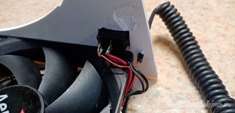 Для надежного закрепления в стойке вентилятора посверлил отверстие на микрон меньше диаметра кабеля. С усилием вставил и приклеил циакрином.