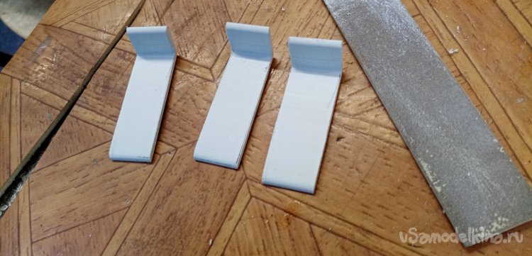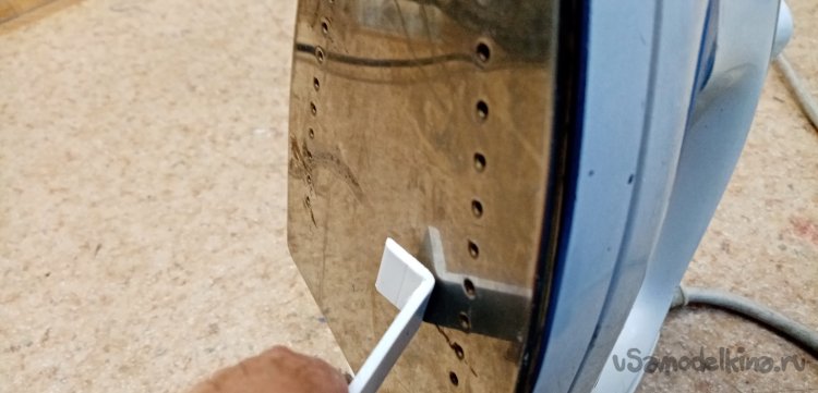 Пробовал греть строительным феном, пластик разогревается широко, согнуть его четко по линии не получается. Испортил несколько заготовок. По новой режу уголок, зачищаю края. Попробую нагреть на краю подошвы утюга. Не торопясь прогреваю полоску с внутренней стороны и с внешней.