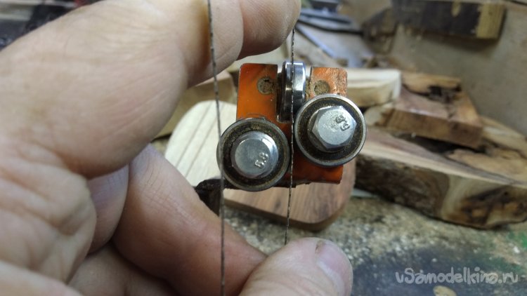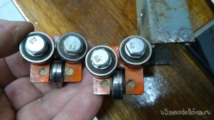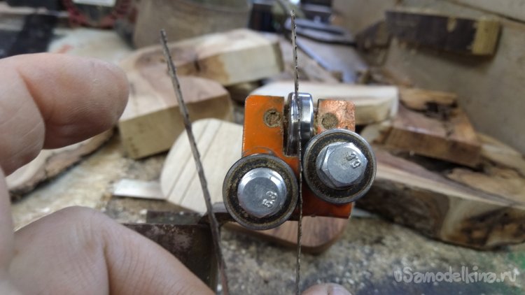 Зазор между подшипниками делаем равным двум толщинам полотна, это при разносе подшипников миллиметров на пять-шесть. Больше их разносить не стоит, нам ведь надо чтобы полотно не вихляло направо-налево, а такой разнос, гарантированно вместе с зазором между подшипниками создаст искривление полотна на доли градуса, (не считал и не проверял, эмпирически высчитал, по отклонению от оси движения, может и градус-полтора)