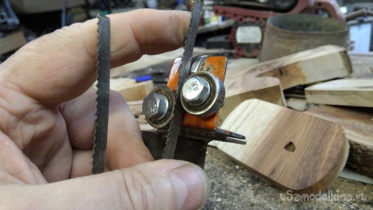 Зато теперь при попадании опилок, щепок, обрезков древесины, которые образуются при фигурном пилении, деталь ведь приходится двигать вперёд-назад выпиливая щели чуть толще самого полотна или вдвое толще, вот тогда и образуются обрезки которые полотно стремится утащить в щель.