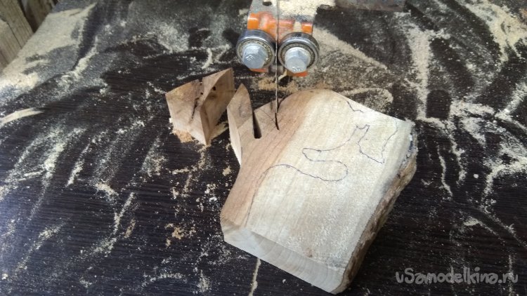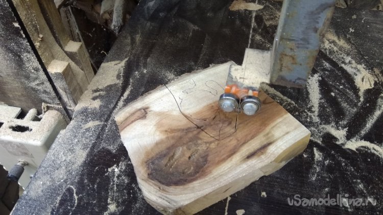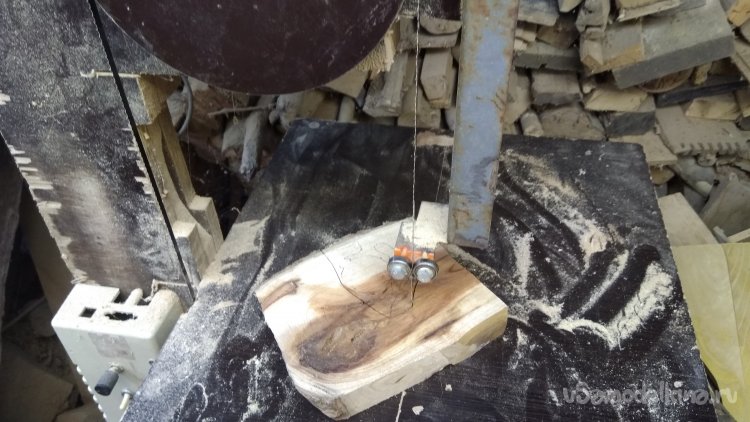 Ну вот. Ленточная пила, на ней и выпиливаем то, что недавно нарисовали на планках, напиленных из чурки, отпиленной от ветки камфорного лавра. Ведь просто звучит?