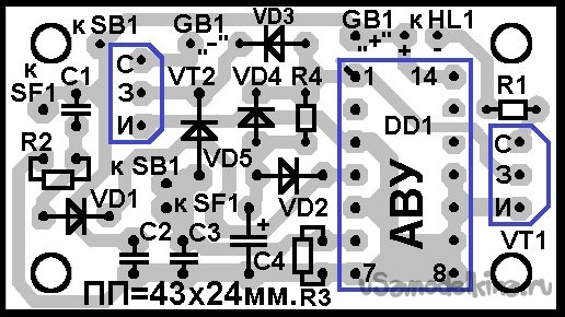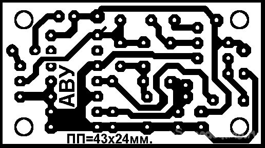 Печатная плата АВУ выполнена из односторонне фольгированного стеклотекстолита размерами 43 х 24 х 1,5 мм (см. рисунки 2 и 3).