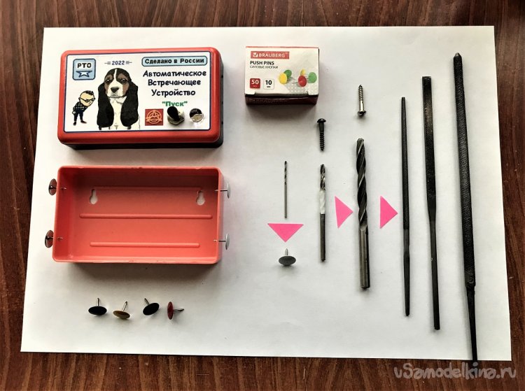 3). Скрепление двух половинок корпуса цветными силовыми кнопками – гвоздиками PUSH PINS фирмы BRAUBERG.