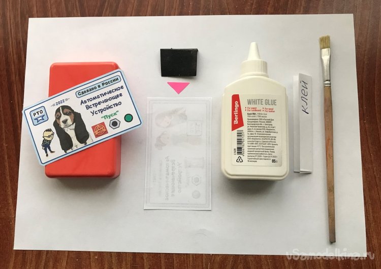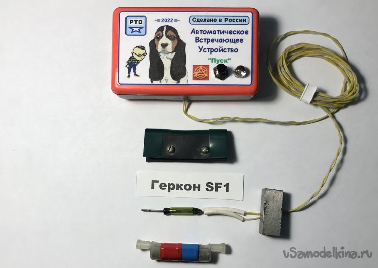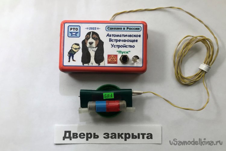 Плата АВУ соединяется с герконом двумя проводниками, выведенными снизу между двумя половинками корпуса. Задняя половинка корпуса АВУ обклеена самоклеящейся плёнкой (прямоугольным кусочком размерами 87 х 48 мм) под дерево. Поверх плёнки скотчем закреплена этикетка «РТО» (см. рисунок 5).