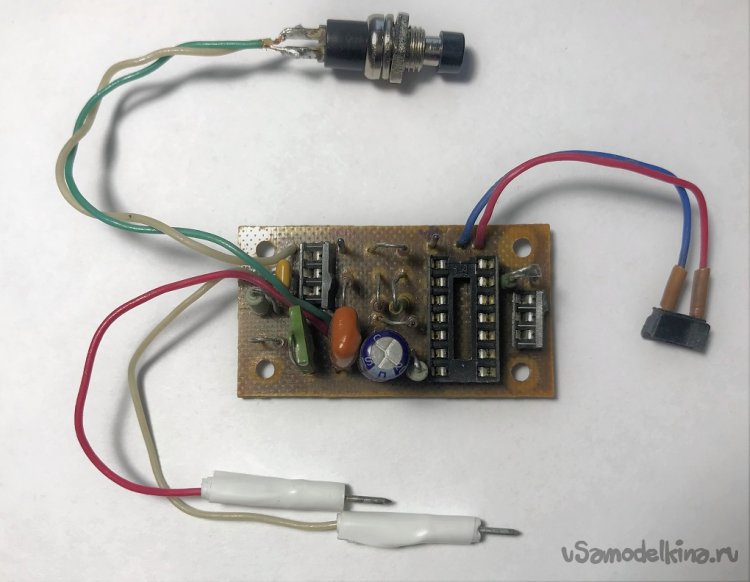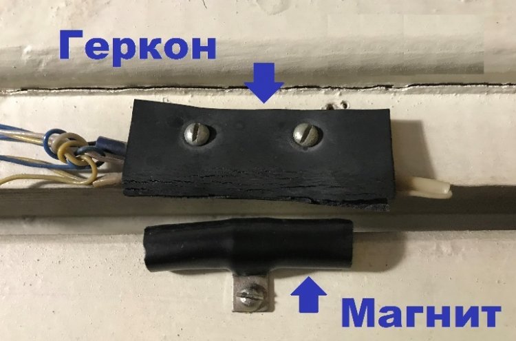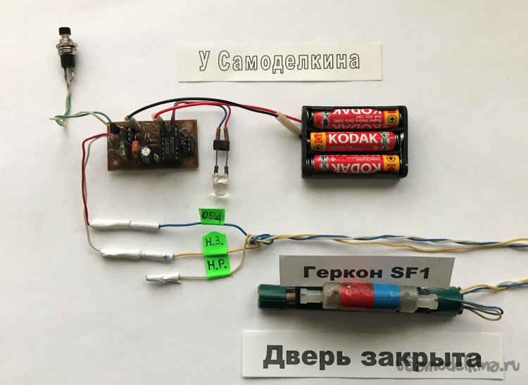 1). Геркон оригинально соединяется с платой неразрываемой двухпроводной линией связи. Торчащий из гнезда штекер увеличивал бы габаритные размеры и надёжность соединения.