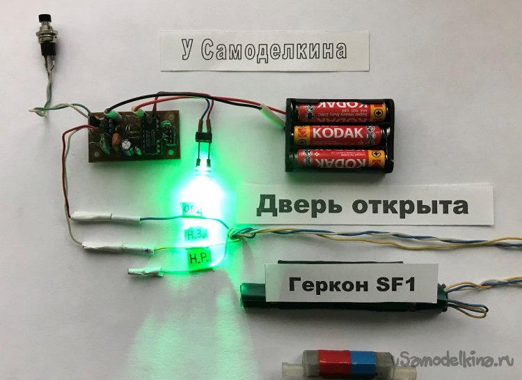 В исходном состоянии (когда дверь закрыта) контакты геркона SF1 под воздействием постоянного магнита находятся в сработанном (нижнем по схеме) положении.