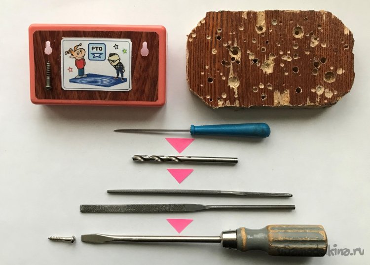 Для прорезания ушек: а) центры отверстий намечают шилом; б) отверстия сверлят сверлом; в) отверстия доводят до нужной формы круглым и плоским надфилем. Диаметр больших (нижних) отверстий должен получиться на 0,2 … 0, 4 мм больше диаметра головок шурупов, на которые будет «навешиваться» корпус АВУ.
