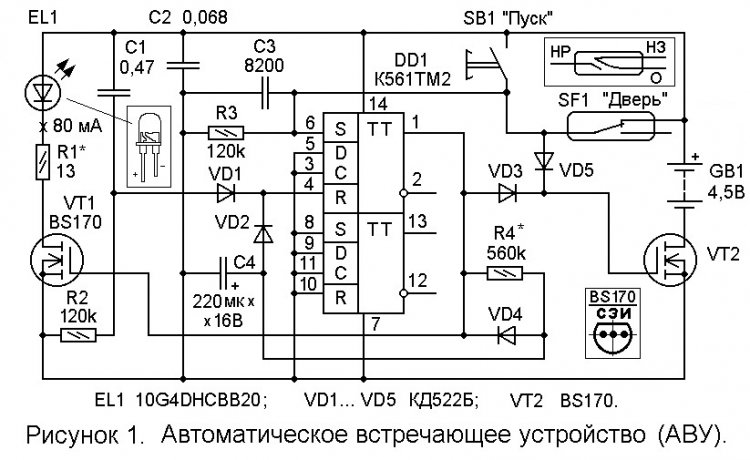 При открывании входной двери или кратковременном нажатии на кнопку SB1 «Пуск» напряжение положительной полярности с батареи GB1 (через замкнувшиеся контакты и диод VD5) поступает на затвор транзистора VT2 и открывает транзистор. Цепь «минус» батареи GB1 замыкается низким (почти нулевым) сопротивлением канала сток-исток полевого транзистора VT2 и напряжение питания батареи GB1 с истока VT2 подаётся на всю схему. Одновременно «+» питания с общего контакта геркона SF1 (или кнопки SB1 «Пуск») поступает на вход S (Set – «Установка») (вывод 6) триггера DD1 и взводит триггер: на прямом выходе (выводе 1) DD1 устанавливается логическая 1. Эта лог.1 открывает диод VD3 и высокий потенциал с катода VD3 поступает на затвор VT2. Теперь (спустя даже доли секунды после замыкания контактов SF1) дверь можно закрыть, а АВУ останется включённым, так как взведённый триггер DD1 подтверждает открытое состояние VT2. Кроме того, взведённый триггер логической 1 на прямом выходе (выводе 1) DD1 открывает токовый ключ-коммутатор VT1. Сопротивление канала сток – исток VT1 резко (до единиц Ом) уменьшается и всё напряжение батареи прикладывается к стоковой нагрузке VT1 – цепи EL1 R1. Светодиод EL1 начинает ярко светиться. Тем временем лог.1 на прямом выходе (выводе 1) DD1 через резистор R4 начинает заряжать конденсатор С4. Через установленное сопротивлением резистора R4 время, конденсатор С4 зарядится до напряжения, равного половине напряжения питания (плюс 0,5…0,7 Вольт на прямо смещённом кремниевом диоде VD2), и одновибратор С4 R4 DD1 VD2 VD4 по входу «Reset» (выводу 4) возвращается в исходное (нулевое) состояние. То есть, на прямом выходе (выводе 1) DD1 снова появляется лог.0, а конденсатор С4 быстро разряжается через диод VD4. В результате стоковая нагрузка EL1 R1 обесточивается транзистором VT1, а цепь «минус» GB1 разрывается транзистором VT2: АВУ переходит в высокоэкономичный режим «OFF». При этом потребление тока от GB1 практически отсутствует. Во всяком случае, ток утечки закрытого канала VT2 на несколько порядков меньше тока саморазряда батареи GB1, поэтому специального тумблера, выключающего питания, в АВУ не требуется.