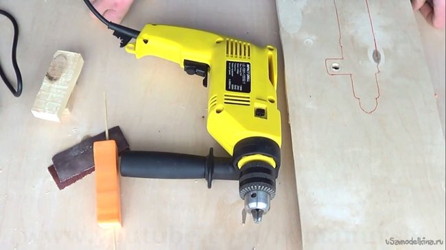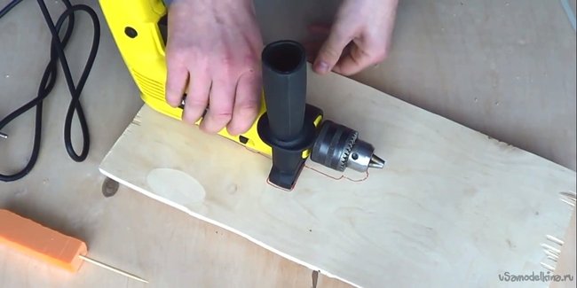 Первым делом нам предстоит делать крепление для дрели. Поэтому необходимо поставить дрель на столик, то есть на кусок фанеры, обвести маркером, проделать отверстие под болт на верхней части ручки. Следует обратить внимание на то, что дрель должна стоять вверх ногами, а необходимо это для того, чтобы инструмент не перегревался, ведь по бокам и снизу у дрели есть ребра для охлаждения. Для того, чтобы закрепить дрель, нужно всего лишь снять болт ручки, провести его сквозь отверстие на фанере и закрепить ручку обратно.