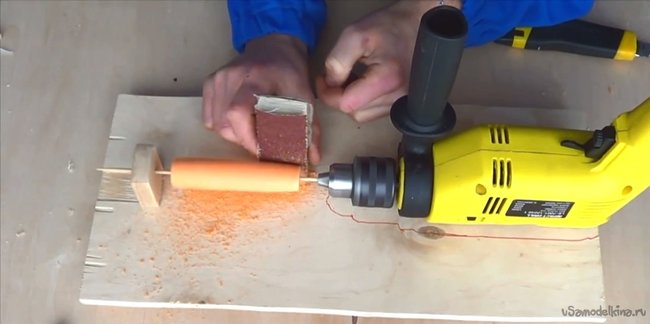Итак, для начала нам понадобится кусок фанеры, к которому заранее нужно приклеить два деревянных бруска, чтобы получилось нечто похожее на столик, далее – дрель, которая должна иметь рукоятку, или другое самодельное крепление, заготовка для тестирования работы станка (в нашем случае пенопластовая), два типа наждачной бумаги – мелкая и крупная, а также два деревянных бруска.