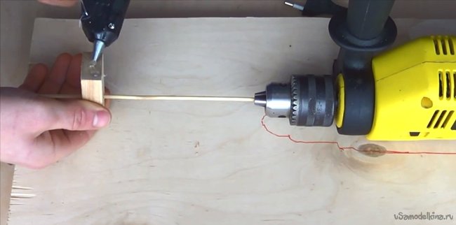 Далее нам предстоит изготовление задней балки нашего станка. Для этого нам потребуется деревянный брусок и сверло небольшого диаметра (чуть больше шпажки для барбекю). Сверлим отверстие на бруске, крепим шпажку вместо сверла на дрели, проводим брусок через нее и фиксируем на фанере при помощи термоклея.