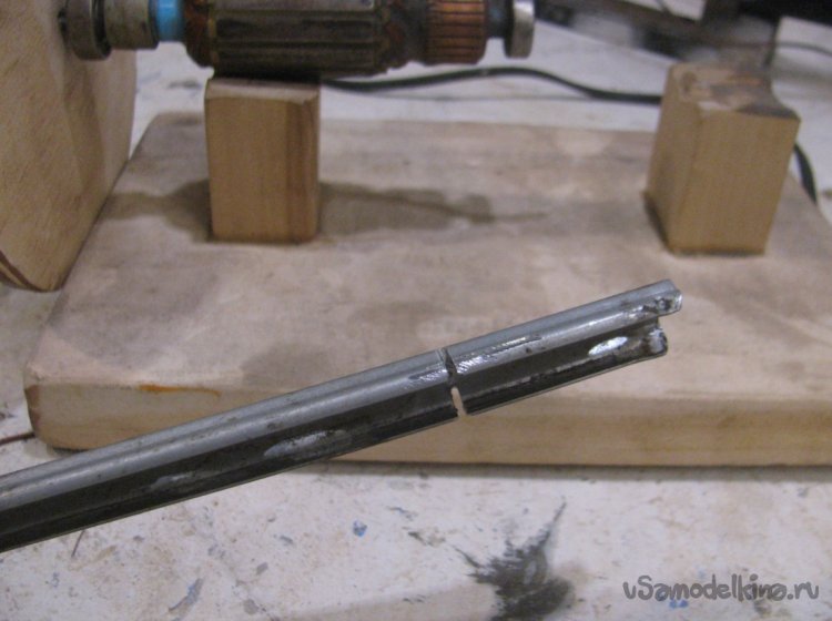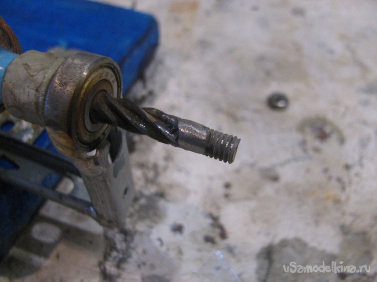 К кончику оси приварил кусок резьбовой шпильки, чтобы надежно и ровно все притянуть гайкой. Лучше не полениться и сделать именно так, не используя клеи. В итоге можно будет снять винт для замены или ремонта.