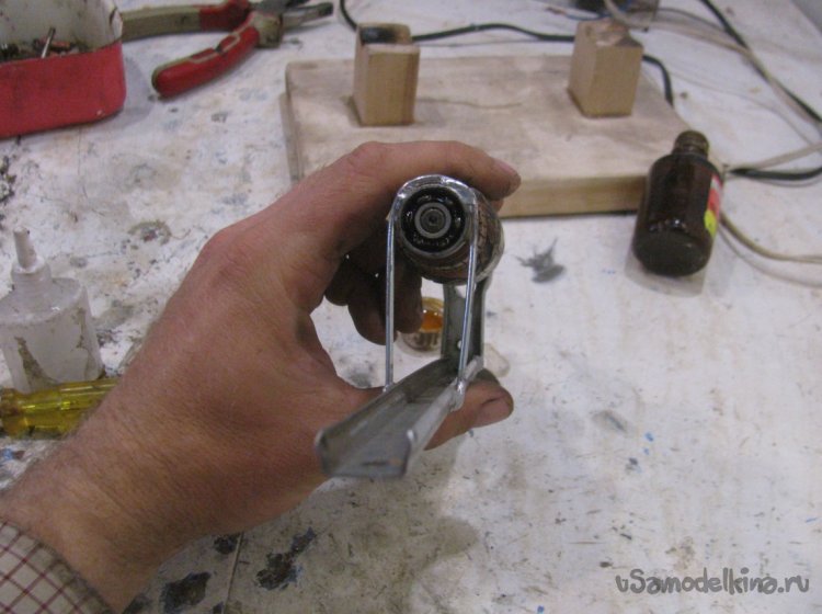 Вращается все это на оси в виде гвоздя, а в палке просверлено отверстие и добавлено смазки, на дно можно кинуть шарик от подшипника.