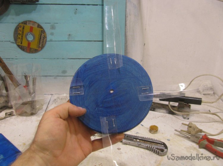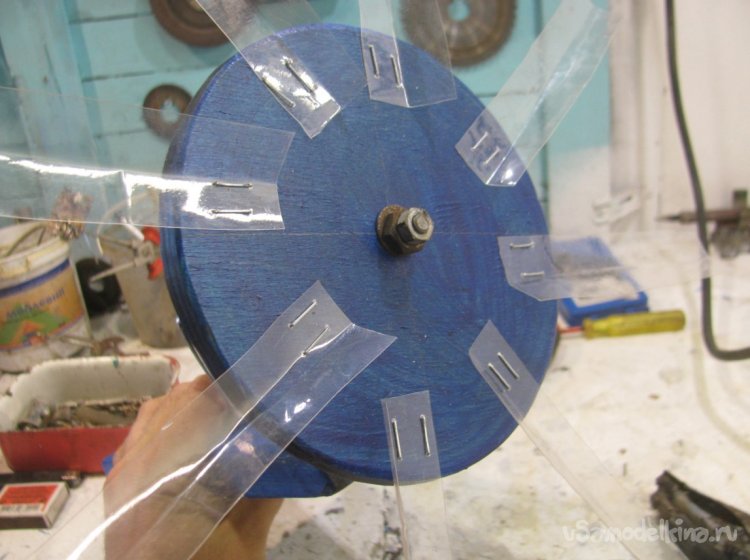 Нарезал лопасти из бутылки и присобачил мебельным степплером. держится крепко, проверено. В завершении лопасти нужно немного как-бы сложить пополам, чтобы получить форму лопаток, держится эта форма долго, временами можно корректировать, а также вообще менять лопасти если надо.