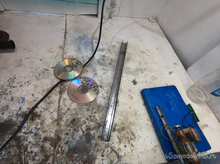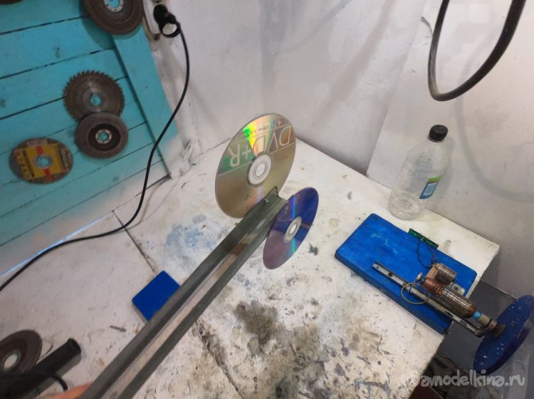 Делаем хвост, чтобы ветряк сам разворачивался против ветра. У меня это кусок направляющей для гипсокартонных конструкций, а также диски. Такого сопротивления хватает для довольно чувствительного разворота ветряка.