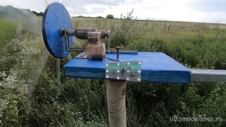 Все готово, можно испытывать, ветер сегодня неоднозначный, рывками и с разных сторон. Как видно, не смотря на приличный дисбаланс ветряк вполне себе неплохо работает. Использованные светодиоды включатся при напряжении около 3В, если поставить еще один мотор, можно вполне заряжать аккумулятор 18650 или аккум от телефона.