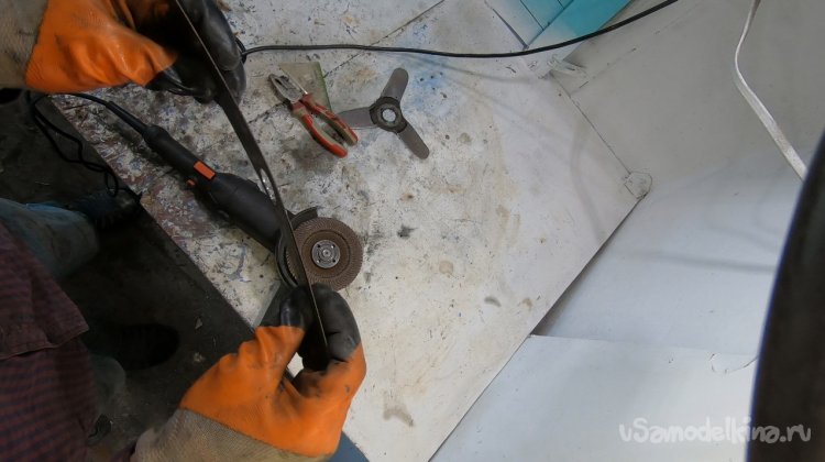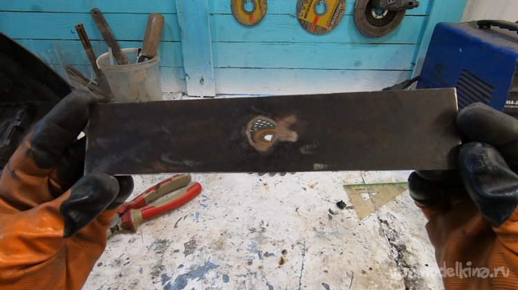 Скос делаем только на одной стороне, он получается вверху, если смотреть на установленный нож. Работаем неспешно, чтобы не перегреть и не отпустить сталь.