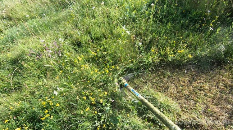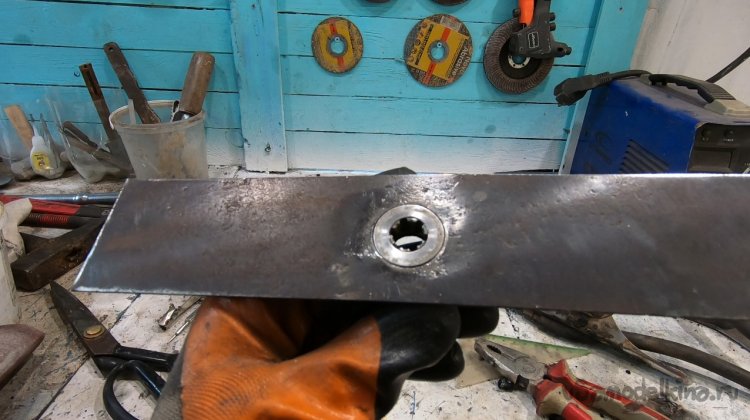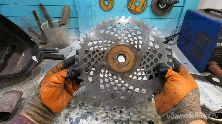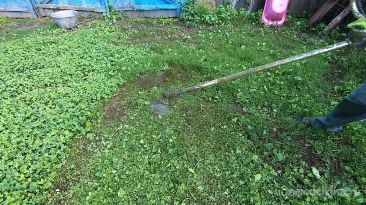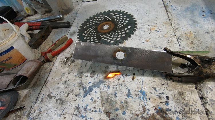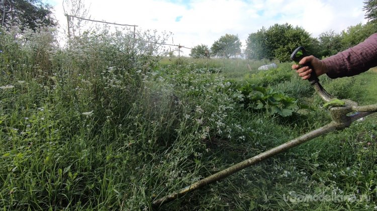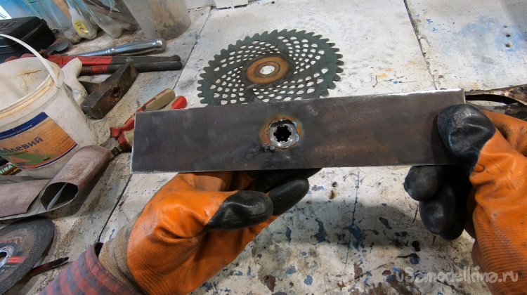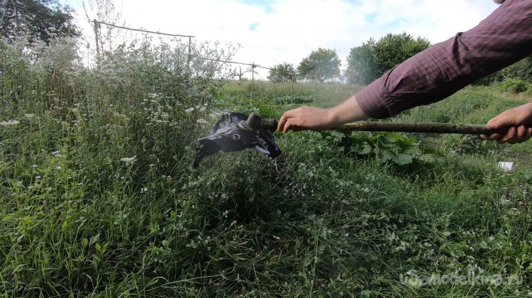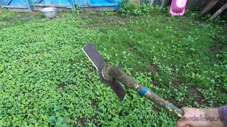Нож сделан из ножовочного полотна, толщина его около 2 мм, он шикарно держит заточку, шикарно косит как сено, так и выбривает грунт просто до земли. У ножа всего две лопасти и уверяю вас, этого достаточно, больше ничего не нужно! В продаже сегодня есть ножи на 3, на 4 и более лопастей, также мощные циркулярные диски и прочая ерунда. Уверяю, все это туфта! Для мотокосы с головой ножа на 2-3 лопасти.