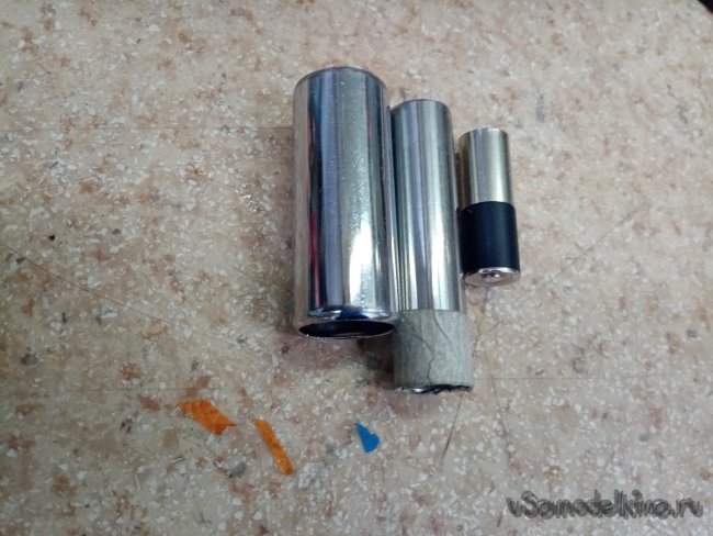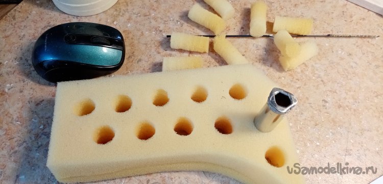 Есть у меня коробочка с резательными трубками. Сами инструменты изготовлены из различных деталей. Есть из антенн, конденсаторов, старых батареек и прочих. Подбираю трубку подходящего диаметра. Из пористой резины вырезаю несколько заготовок.