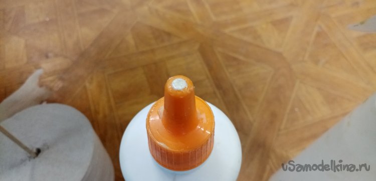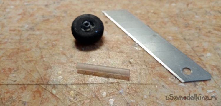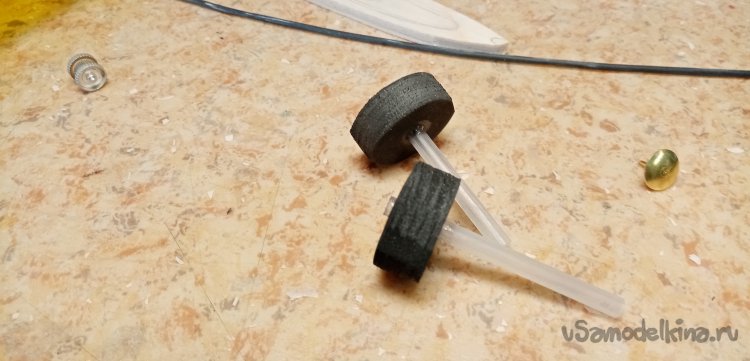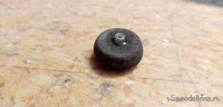 В качестве усиления подбираю пластиковую трубочку внутренним диаметром, подходящим под ось. Немного зачищаю крупной шкуркой для шероховатости. В центре пористой резинки прокалываю отверстие шилом и вставляю трубочку. Приклеиваю циакрином.