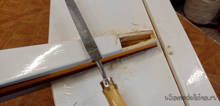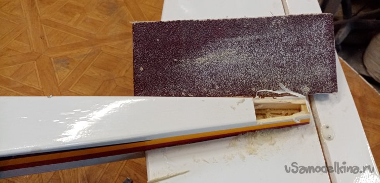 Зачищаю место установки деревянного крепления для стойки.