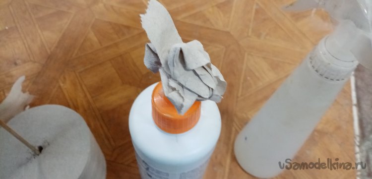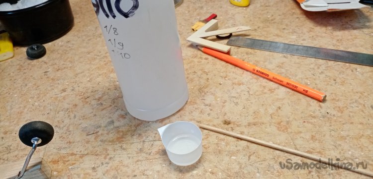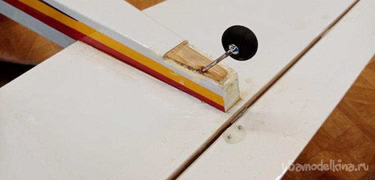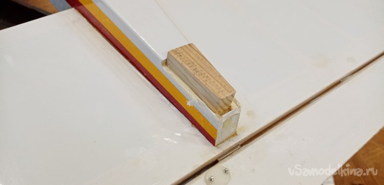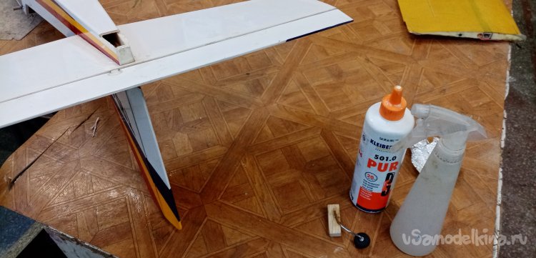 Наконец смола встала, можно монтировать блок на хвостик. Приготовил ПУР 501, брызгалку. Нужно смочить клей водой, быстрее застывает. Немного смачиваю водой место установки наношу клей. Выжидаю немного, начинается легкое вспенивание, устанавливаю деревяшку в отверстие. Немного погодя удаляю лишнюю вылезшую пену, ватной палочкой.