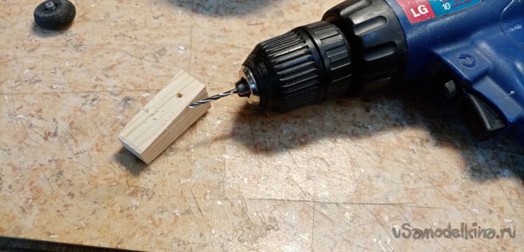 Нужно укрепить стойку на этой деревяшке. Подбираю диаметр сверла. Сверлю отверстие, устанавливаю колесико на стойке.