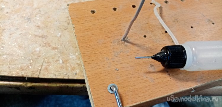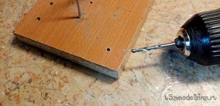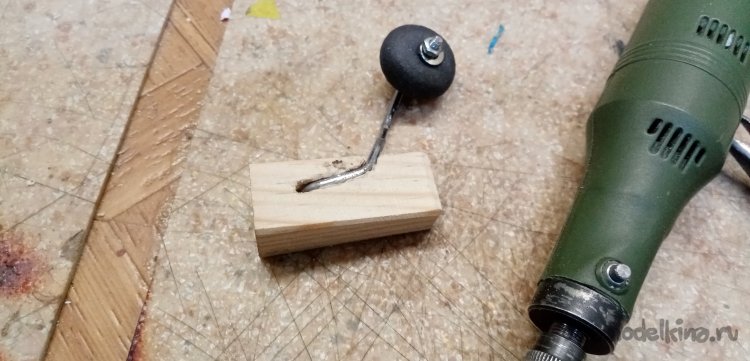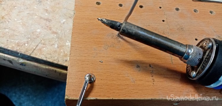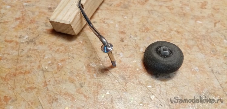 Нужно припаять упорную шайбу для фиксации колесика. Подбираю сверло по диаметру прутика, в деревяшке сверлю вертикальное отверстие. Куда вставляю кончик стойки с установленной уже шайбой. Немного кислоты, паяльник, разогретый до температуры в 300 градусов. Шайбочка припаяна на место.