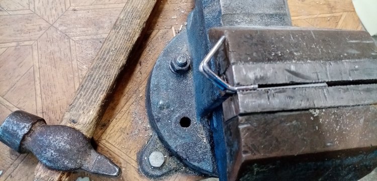 При помощи тисков и плоскогубцев сгибаю заготовку в заковыристую фигуру. Она и будет стойкой для колеса.