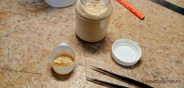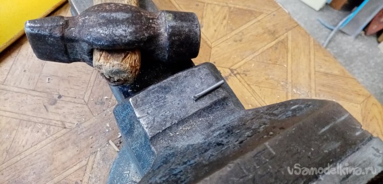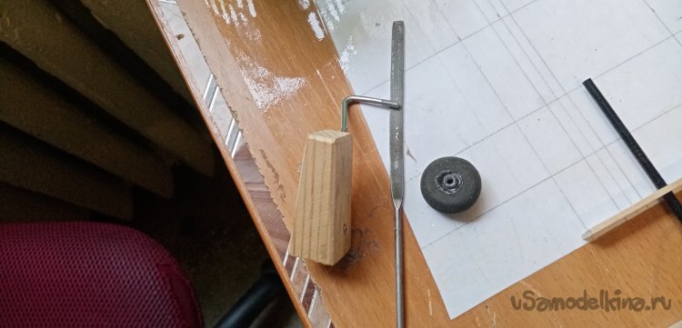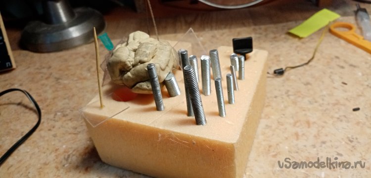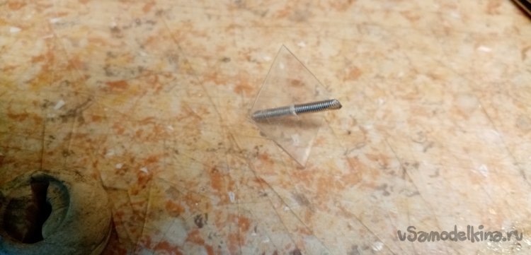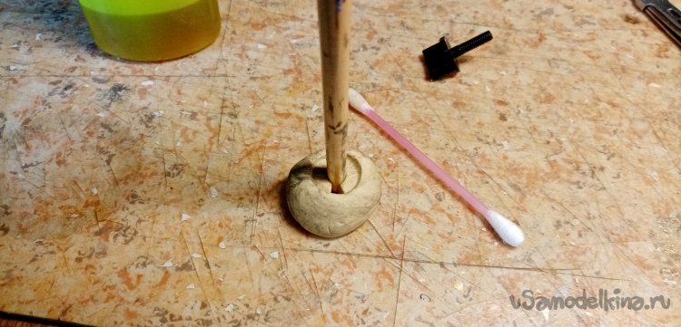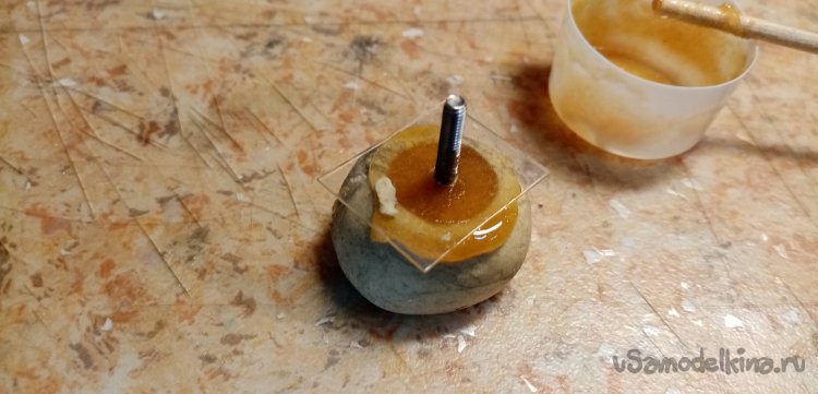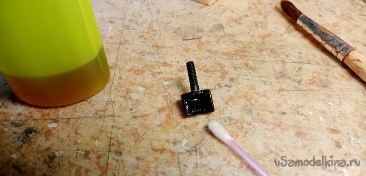 Осталось немного смолы с наполнителем. Сейчас у меня на столе постоянно находится «джельтельменский набор», для изготовления барашков фиксации. Раскатываю из скульптурного пластилина шарик. В него оттискиваю головку барашка, предварительно смазанную маслом. В середине делаю цилиндрик усиления. Заливаю формочку составом. Нужно приготовить шпильку. Расплющиваю конец, насаживаю на нее квадратик пластика и устанавливаю сборку в смолу. Готов еще один барашек и остатки смолы не пропали.