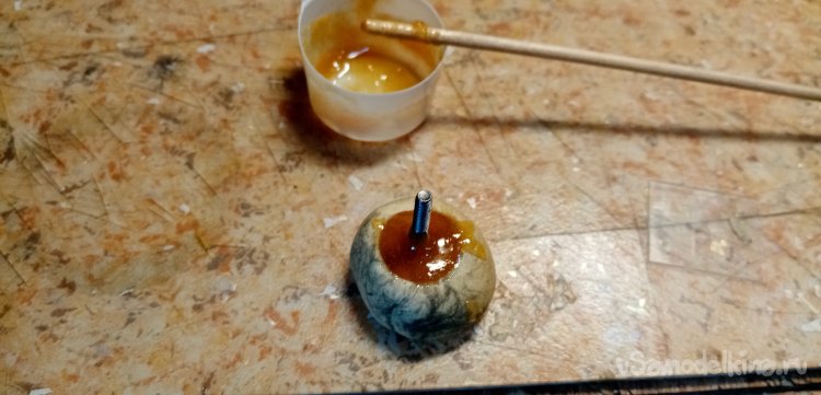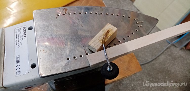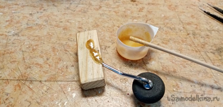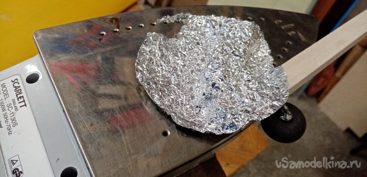 Развожу два грамма состава, добавляю бальзовый наполнитель. Заливаю смолой стойку. Для ускорения процесса подогреваю конструкцию на утюге. Место склейки накрываю фольгой.