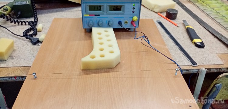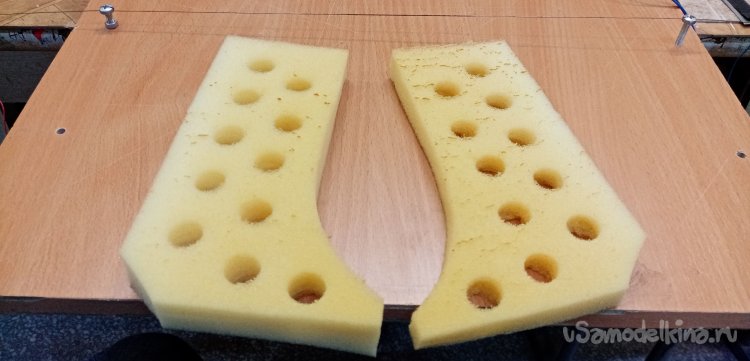 При помощи горизонтального резака и раскаленного нихрома разрезаю заготовку по плоскости на две части. У нас две раковины. Затем промываю поролон водой с хозяйственным мылом от остатков разреза.
