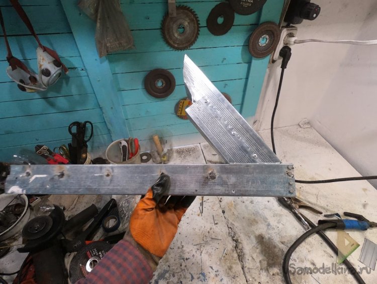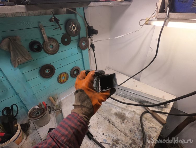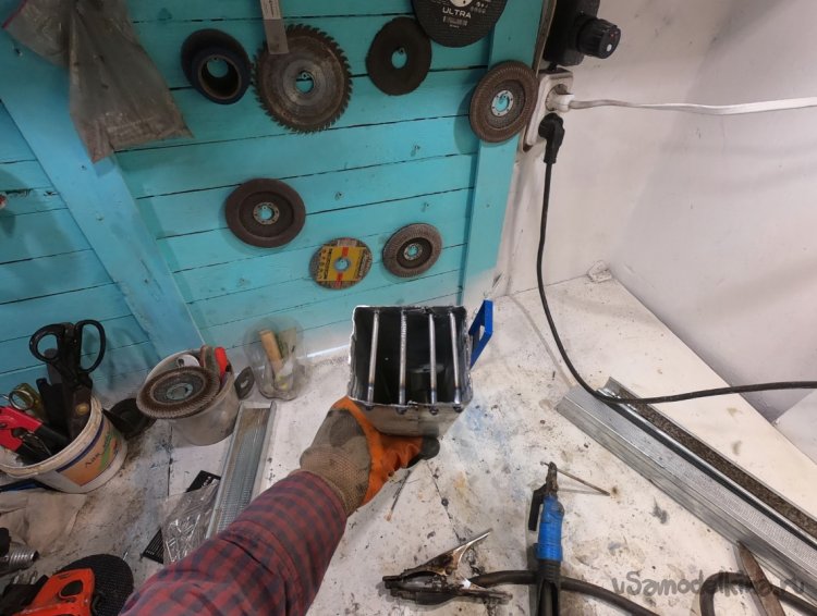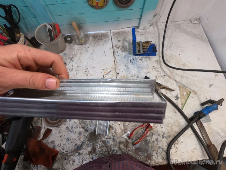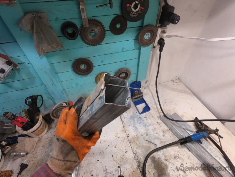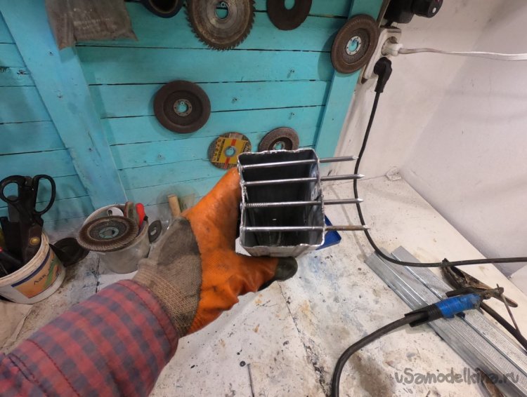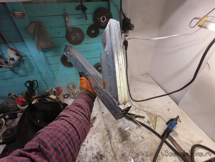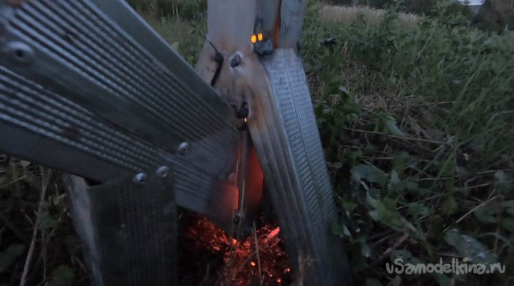 Соединяем два профиля, чтобы получилась труба, я все это сваривал точками через гвоздь. На фото изначально труба вышла высоковата, пламя не доставало доверху, так что потом пришлось обрезать при испытаниях.
