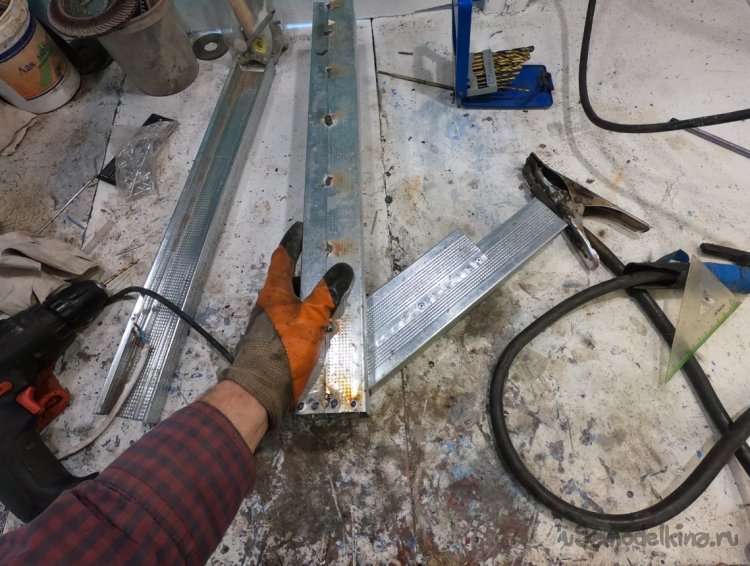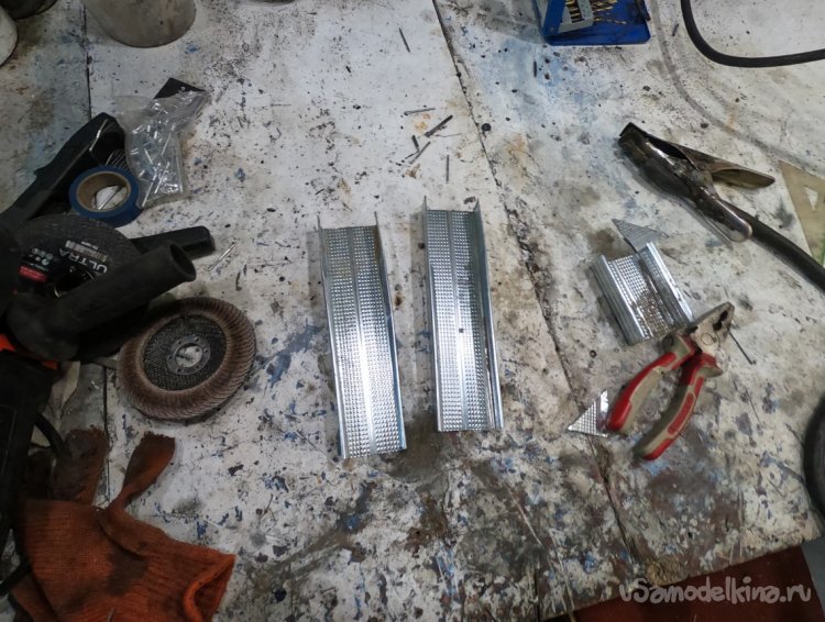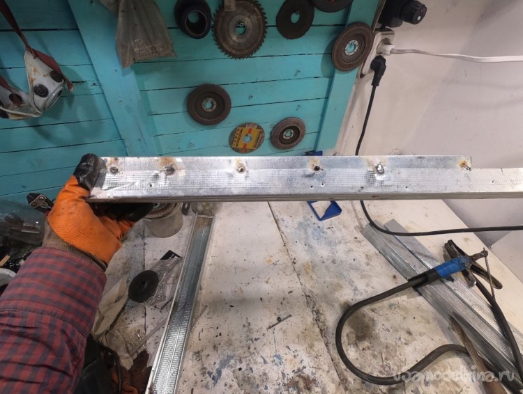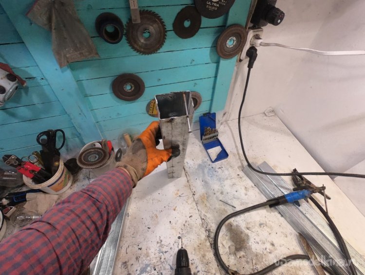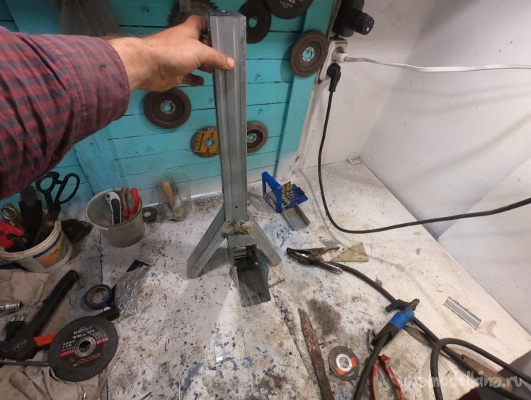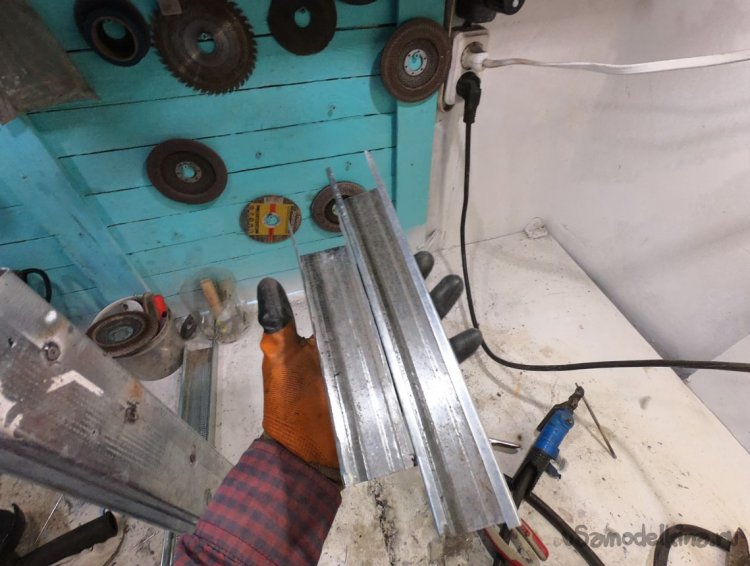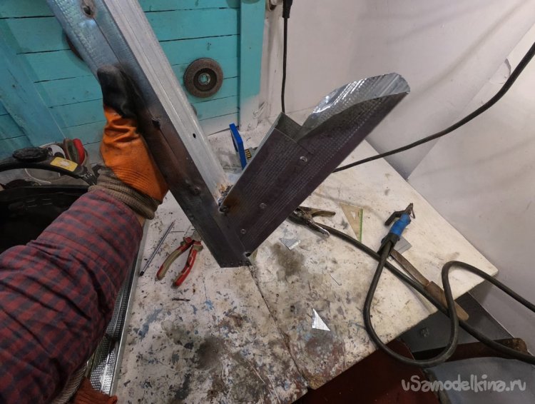 Соединяем два профиля, чтобы получилась труба, я все это сваривал точками через гвоздь. На фото изначально труба вышла высоковата, пламя не доставало доверху, так что потом пришлось обрезать при испытаниях.