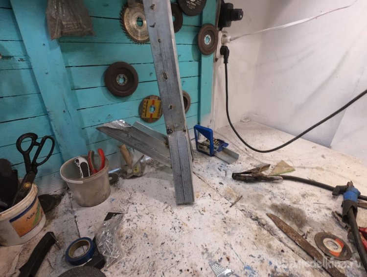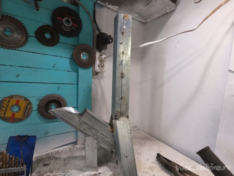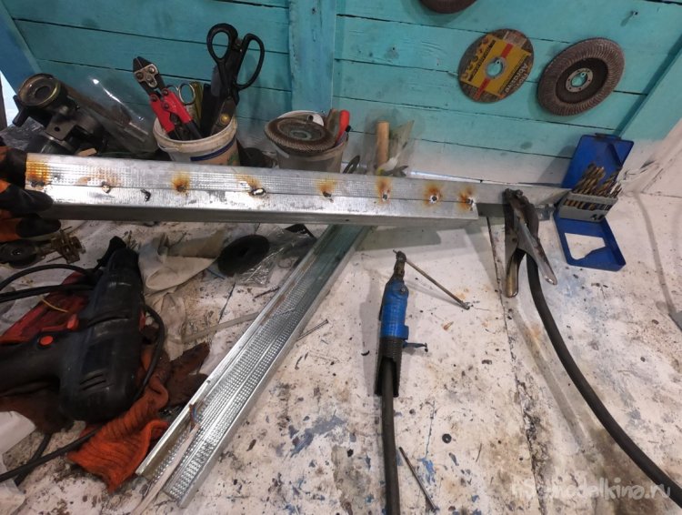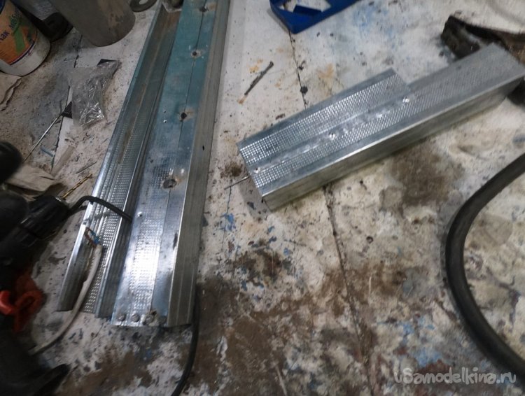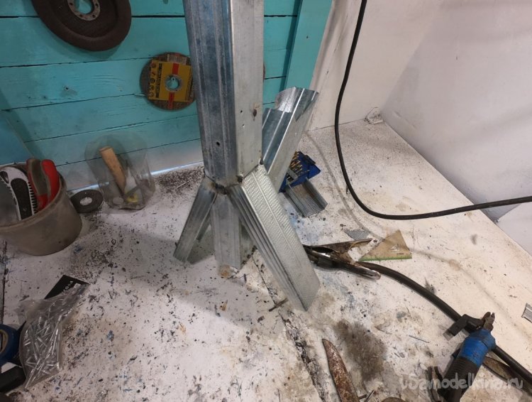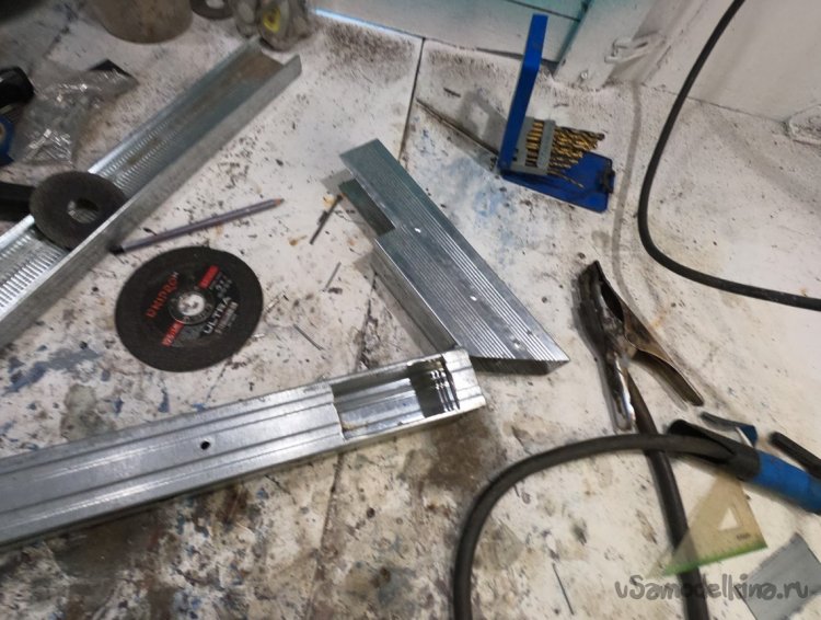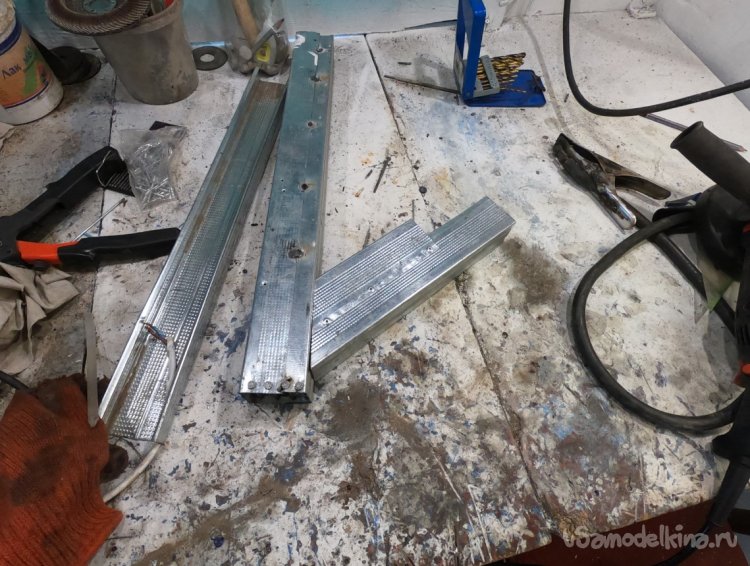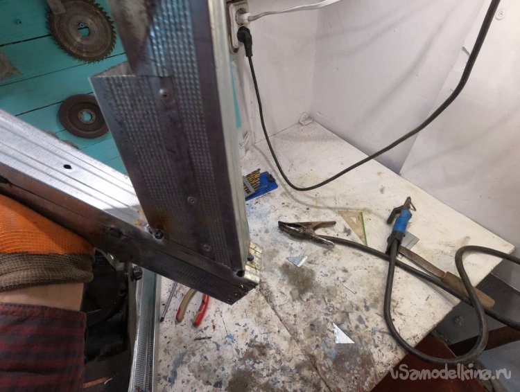 Вот такую печь можно собрать из обрезков гипсокартонных профилей. Сразу отмечу, что варить их тяжело, я варил через гвоздь, иначе сразу дырки. Можно собрать все на маленьких саморезах по металлу, все будет аккуратно и быстро. Можно использовать алюминиевые заклепки, но только там, где температуры невысокие, к примеру, район топки калится докрасна, то есть алюминий поплывет.