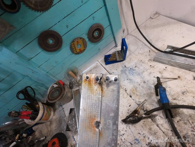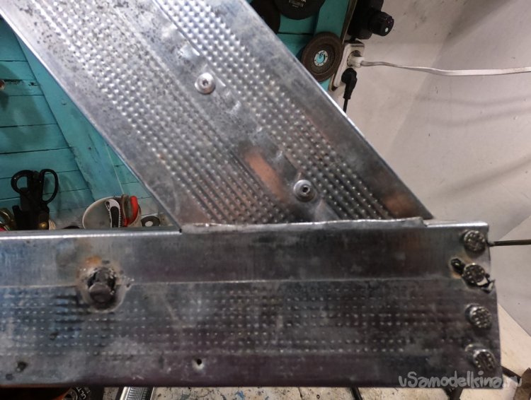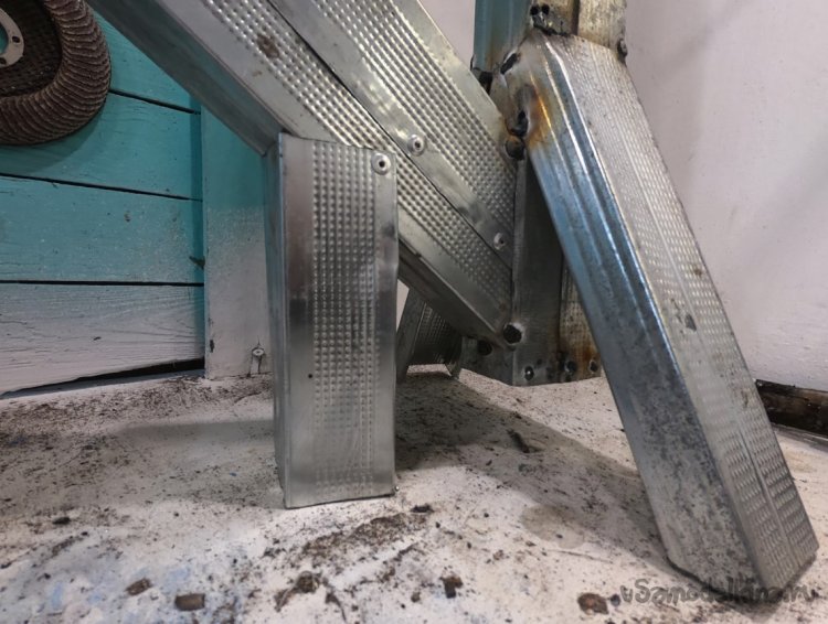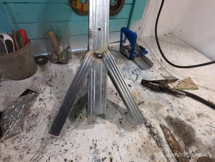 Нарезаем и привариваем ножки, к топке ножку можно прикрепить заклепками. В конструкции не хватает еще одной ножки, без нее конструкция не очень устойчива с посудой на грунте.