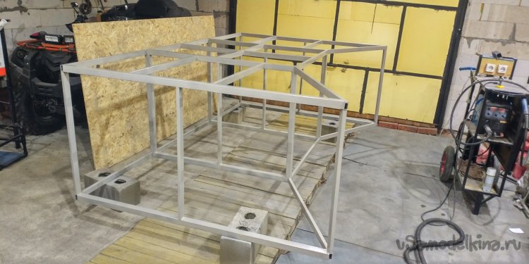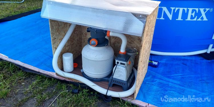 Домик для насоса. Он как бы не совсем обязательный, но я сделал отдельно стоящий. Но скорее всего, насос скоро переедет под помост. т,к., забегая вперед, я уже начал варить павильон. Холодное лето.