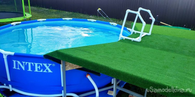 Лестница. Теперь, чтобы деткам было легче залезать в бассейн, я сделал им лестницу. Думал купить, но во первых дорого, во вторых нет того формата, что мне нужен. Поэтому купил 8 хлыстов 32й ПП трубы и спаял сам. Высота 170см, ширина 50см. Лестница съемная, чтобы можно было бассейн накрывать тентом. Итого материала вышло на 2000 рублей.