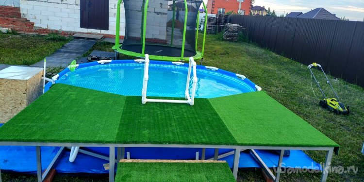 Помост. Естественно для детей сразу было решено делать помост. Тем более еще прохладно. Собрал весь профиль в гараже и сварил. Профиля не хватило, сгонял и докупил. Выполнено все из профтрубы 40х40 и 40х20. Габариты 170х90см. Т.е. помост чут выше бассейна. Затем сверху положли 3 листа ОСБ-9 и накрыл газонной травой. Итого 7000 рублей.