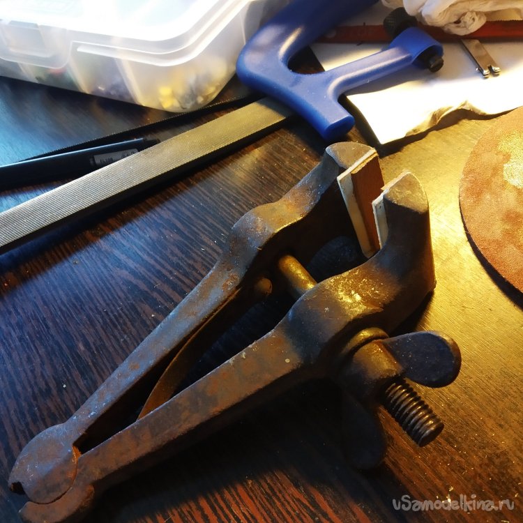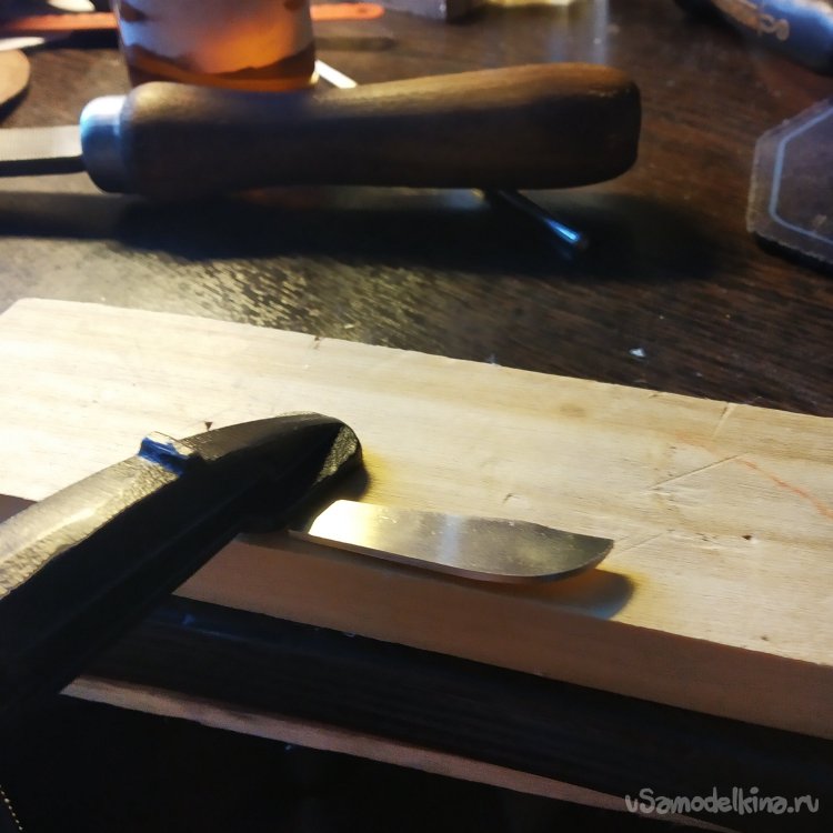 Далее нужно сделать спуски на «щучке» клинка. Для этого я нашел свои старые ювелирные тиски с накладками из сапеле на мягких подушечках, чтобы ничего не царапалось и не мялось. В них я зажал клинок и сделал спуски алмазным надфилем, купленным уже у другого хорошего человека на том же рынке. Да, тоже советским. Люблю советский инструмент, он моего прадеда пережил, и меня переживет. И, возможно, внуков моих.