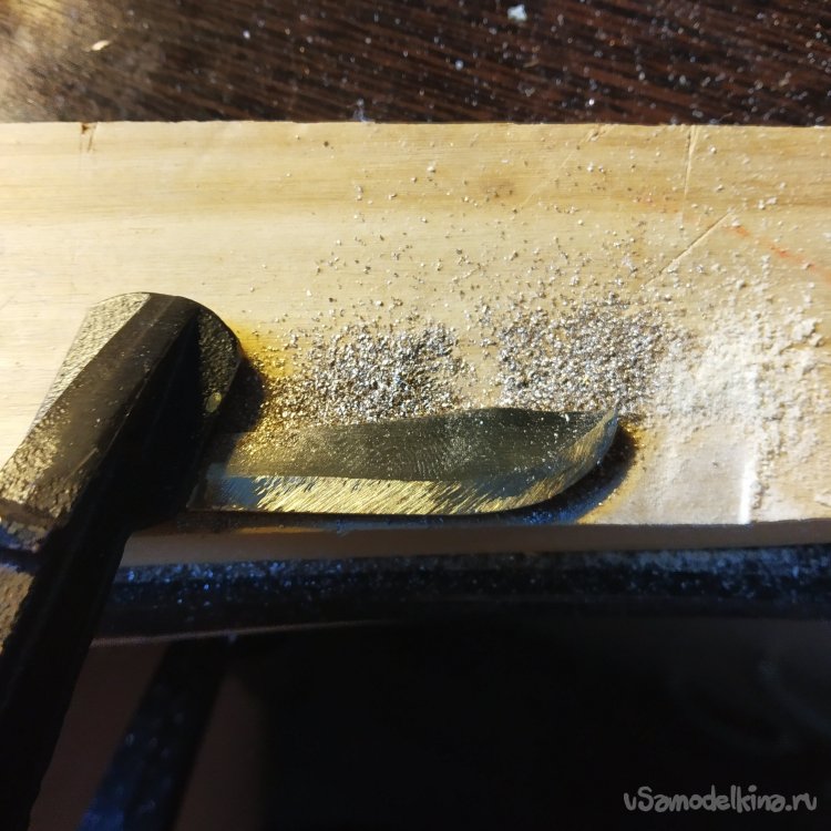 В итоге я запорол первое отверстие, так что пришлось сверлить второе. Тут я уже сточил внутренние углы отверстия, чтобы клинок сел лучше.