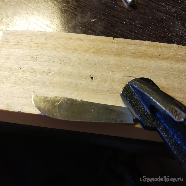 Теперь формирование спусков. Для этого я взял относительно ровный кусок березы и струбцину. Кусок положил на стол, а струбциной притянул клинок к березе, а березу к столу.