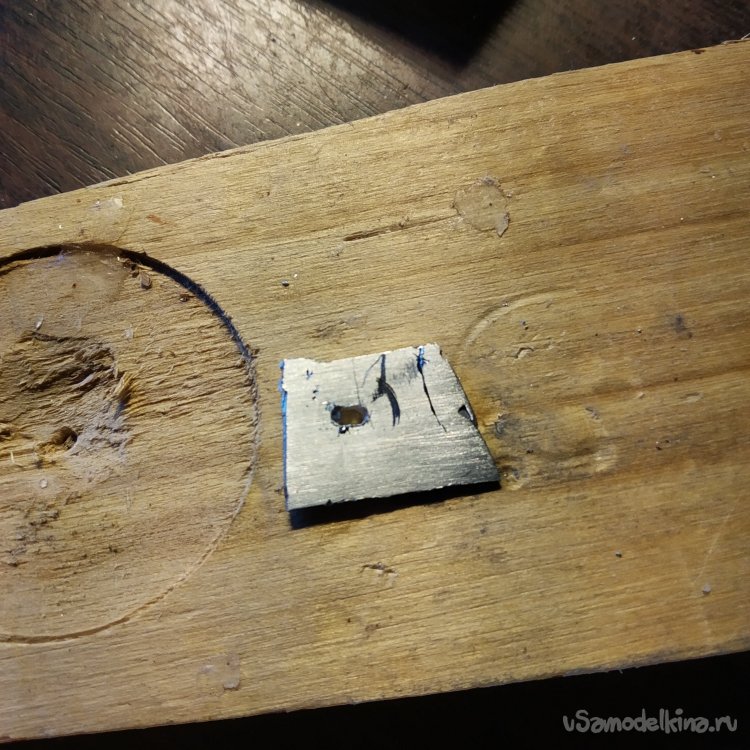 Теперь нужно эту пластинку просверлить в двух местах, чтоб образовалось овальное отверстие. Для этого керню пластинку и иду заряжать дрель.