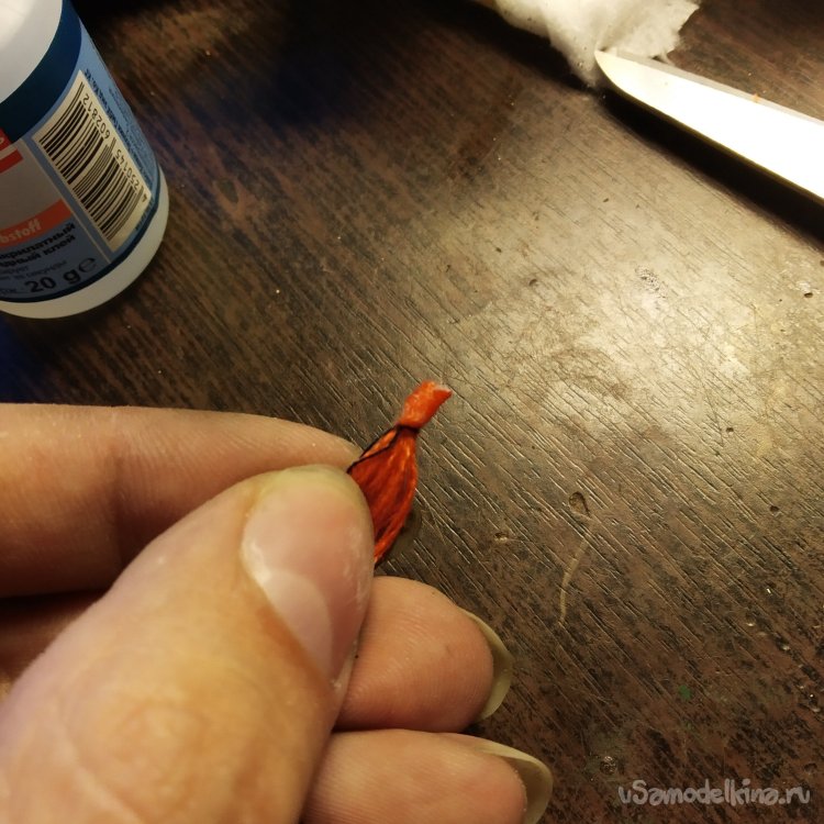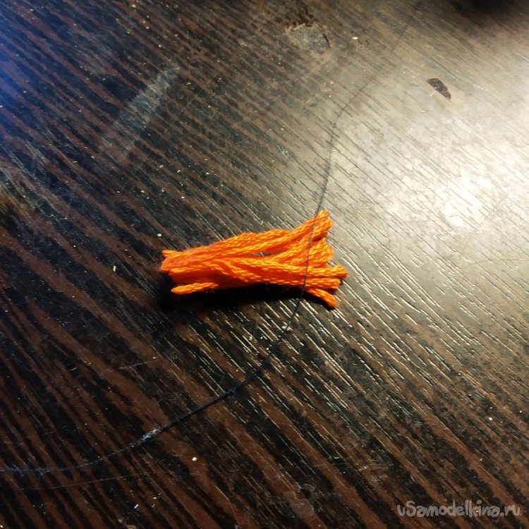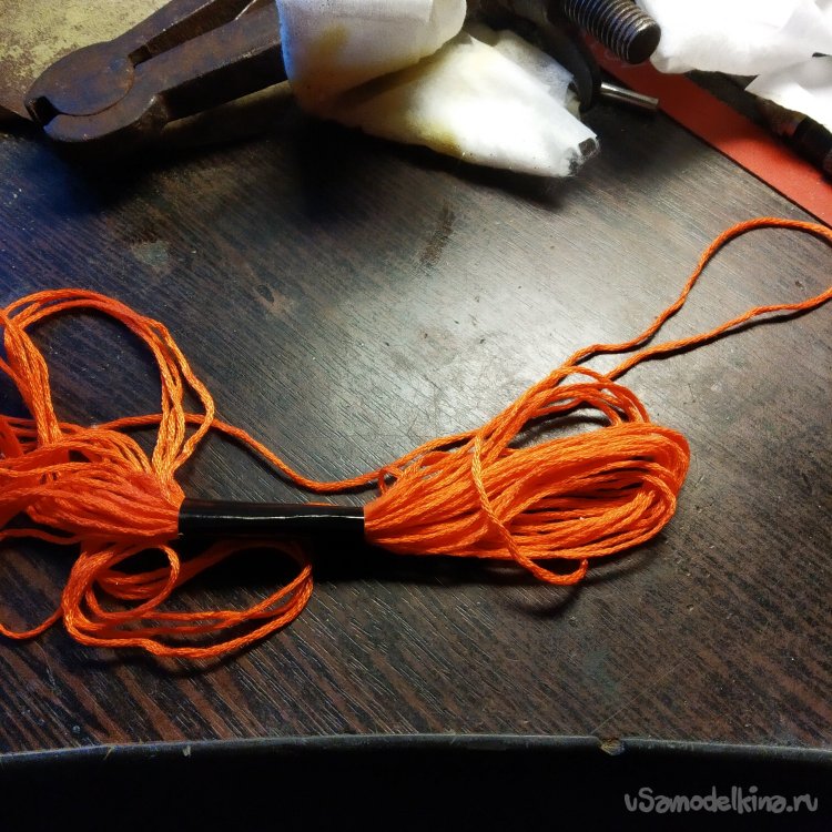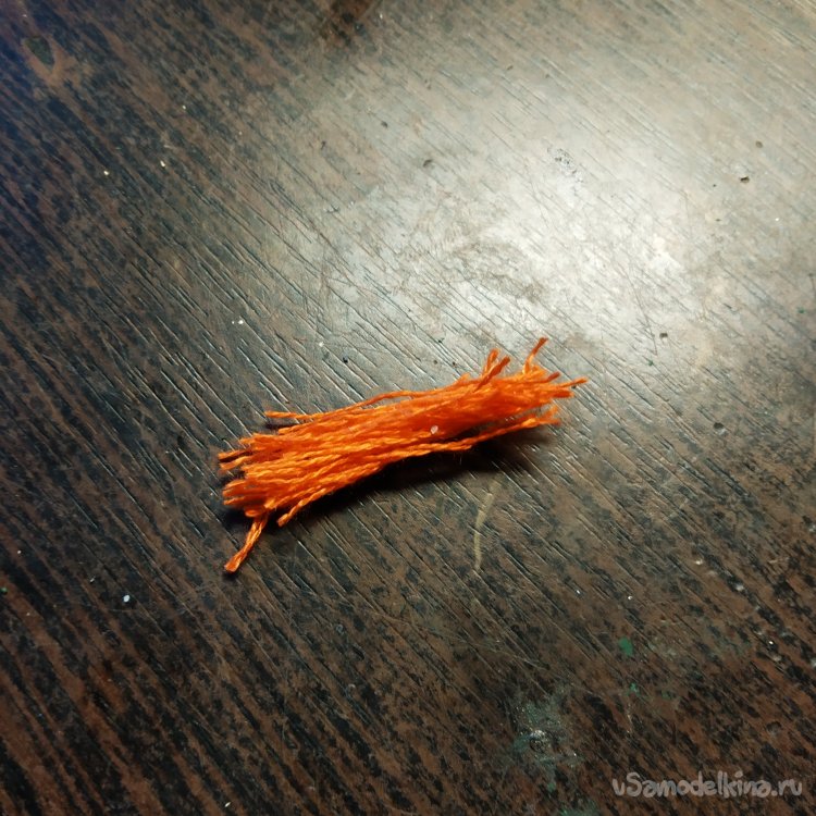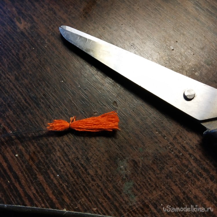 Но я решил не останавливаться и изготовить еще и традиционную красную кисточку для меча. Для этого я использовал нитки мулине. От мотка я отрезал пучок, разобрал его на отдельные ниточки и перевязал их ближе к концу. И склеил космофеном.