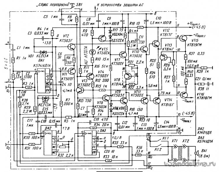 33 года назад собрал пару таких усилителей, работали безупречно, но после аварийного скачка напряжения в сети пришлось ремонтировать.