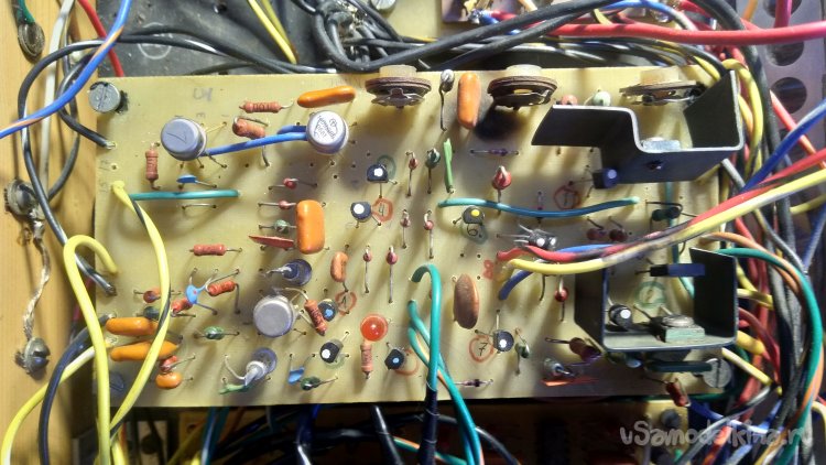 Пока разбирался с усилителем, стрельнул белым дымом конденсатор в осциллографе. Пришлось и осциллограф вскрывать, и чинить.