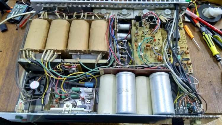 Разобрал, крышка на четырёх винтах. Тестером прозвонил цепи питания. Сгорели силовые транзисторы стабилизатора напряжения, короткое замыкание в транзисторах, а там напряжение более ста вольт с трансформатора, само питание усилителя 90 вольт со средней точкой. Пробило транзисторы, ну и потянуло за собой остальное. При номинальной напряжении блок защиты отрабатывает, а вот 380 вместо 220, это уже перебор. Хоть и выбило автоматы сетевые, но бед наделать успело. Кроме усилителя погорели телевизоры, мулитиварка, кондиционер.