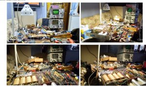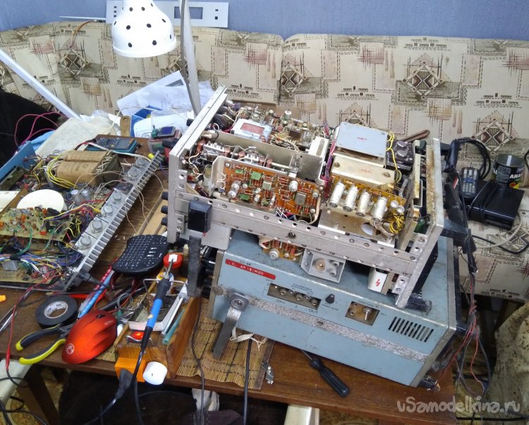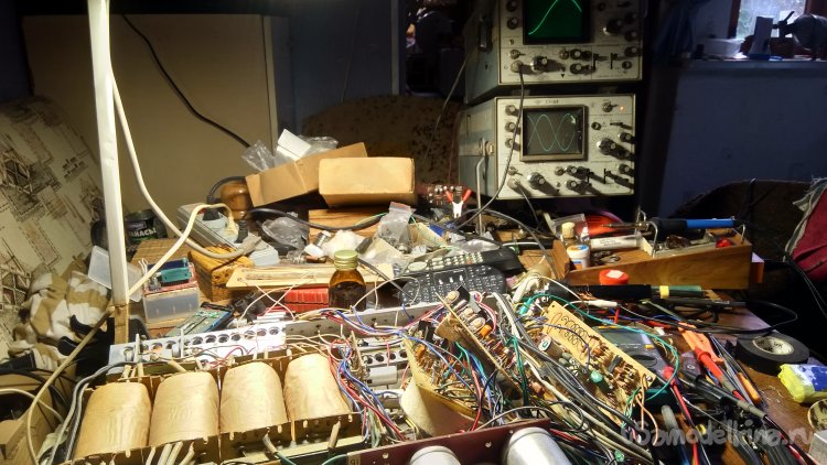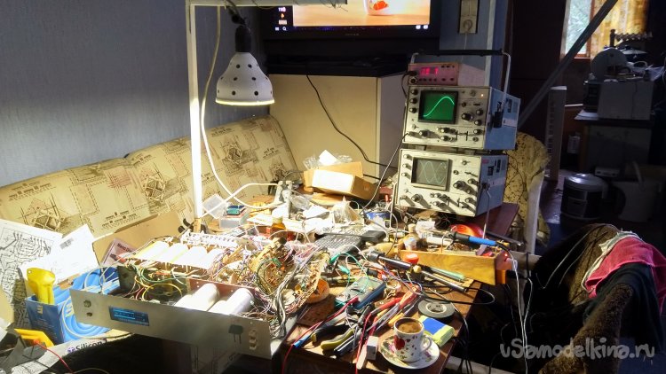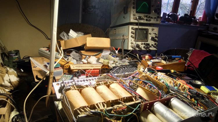 Временное рабочее место. На самом верху самодельный генератор со свипом.