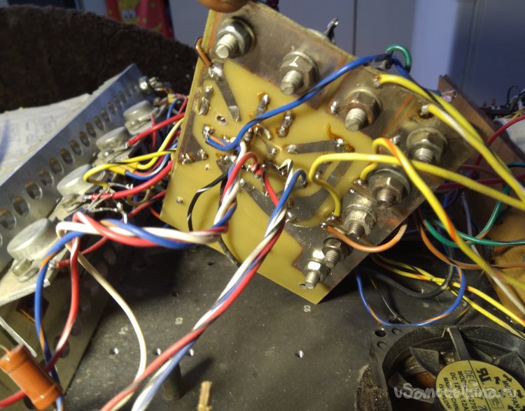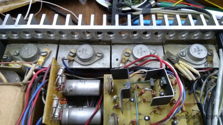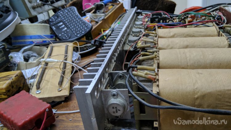 Выходные транзисторы прикручены к уголкам без прокладок, а уголки через слюдяные прокладки к радиатору, для уменьшения теплового сопротивления.