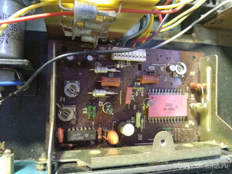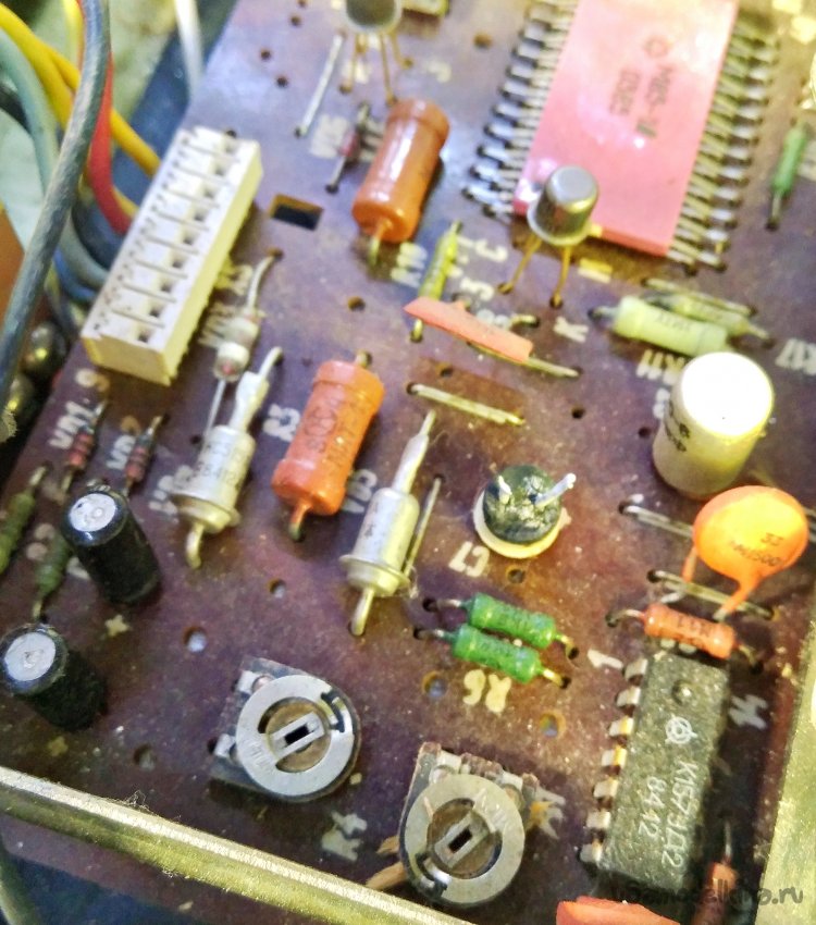 Кроме блока стабилизации питания сгорели выходные транзисторы усилителя, КТ819Г, КТ818Г, стабилитрон, резисторы, ну в общем кучку выпаял всякого. В индикаторе уровня микросхема К157УД2 сгорела и электролит отстрелился. Вот реально, с хлопком улетел алюминиевый стаканчик.